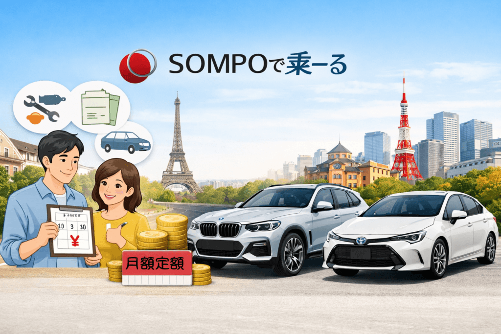 | SOMPOで乗ーる | 走行距離・メンテ・中途解約可否などをカスタムしやすい設計(プラン次第) | 基本コミではない(必要なら組み込み/別途加入の考え方) | 原則は解約金が発生し得るが、中途解約オプションの考え方あり | 国産+輸入車まで幅広い(車種の自由度を重視) | 返却/再契約/乗り換え等(条件により「もらえる」選択肢の話も) | 外車も含め車種の自由度を重視したい人/自分に合わせて条件を組みたい人 |