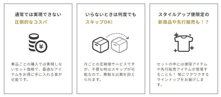 SPUスタイルアップ便には多くの魅力があります。まず、毎月届くアイテムはプロのスタイリストが選んでくれるので、自分に合ったおしゃれなコーディネートを楽しむことができます。また、アイテムは最新のトレンドを押さえたものばかりなので、常に新しいスタイルに挑戦できます。さらに、サブスクリプション形式なので、自分で選ぶ手間が省け、忙しい方にもぴったりです。