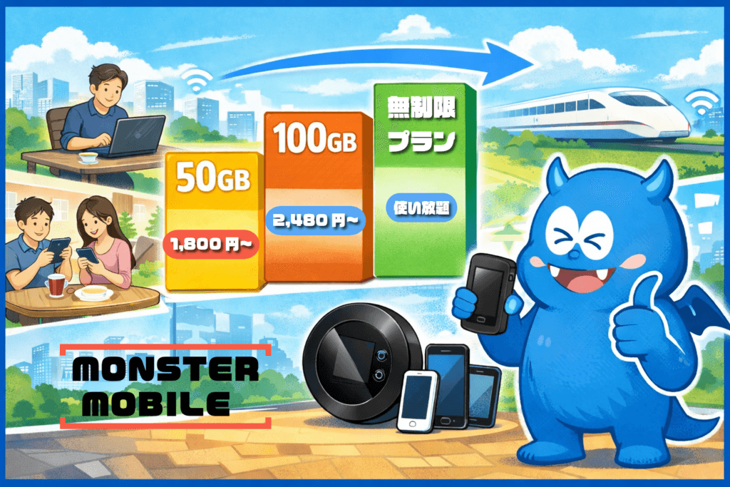 MONSTER MOBILEを検討しているものの、「本当に安いのか」「縛りなしでも使いやすいのか」「自分に合う容量はどれか」で迷う方は多いです。とくにモバイルWi-Fiは、月額だけで決めるとあとで容量不足や解約条件で後悔しやすいため、料金だけでなく契約条件や返却ルールまでまとめて確認することが大切です。MONSTER MOBILEは、20GB・50GB・100GBの通常プランに加え、無制限プランも用意されており、短期利用から中長期利用まで選びやすいサービスです。